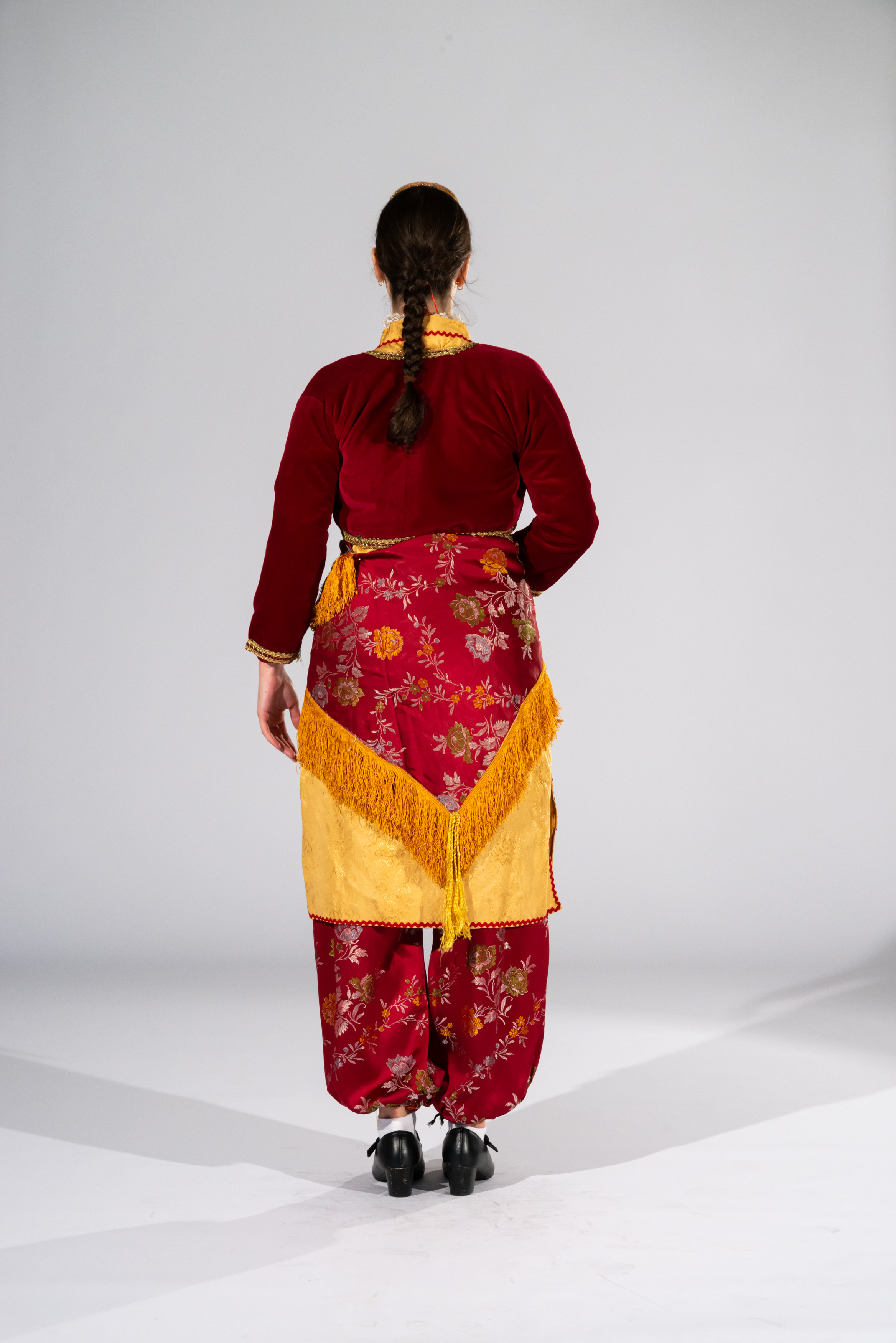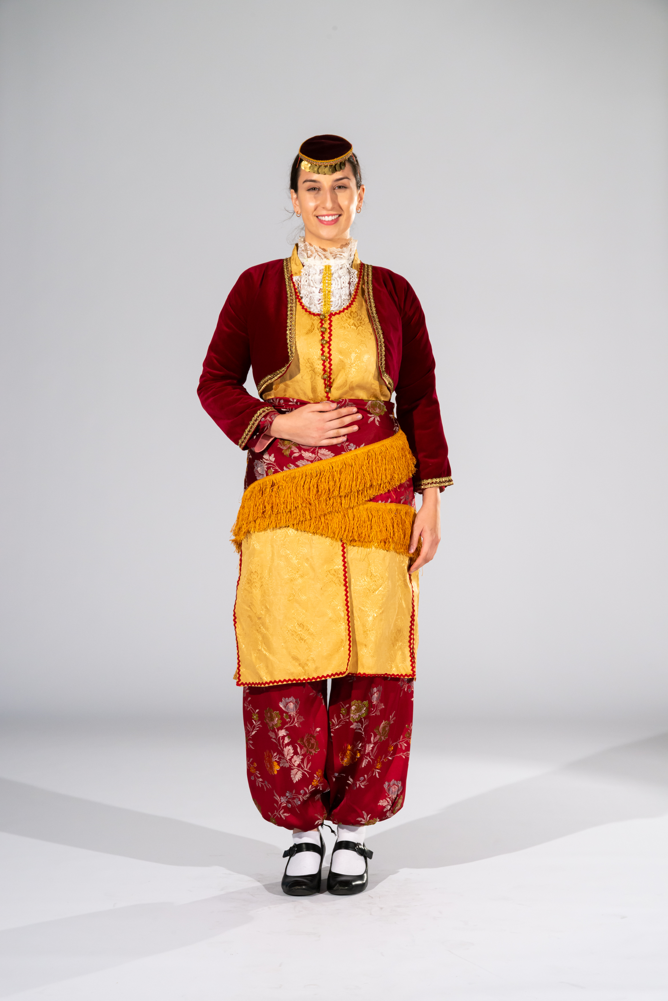 Katifé: a velvet vest worn on top of the zipúna. The vest is quite short and form-fitting. Its length ranges from the shoulder to just above the waist. It usually comes in a range of colours but the most common is red, maroon and plum. Katifé is embroidered with gold stitching at the neck, waist, chest and sleeves.