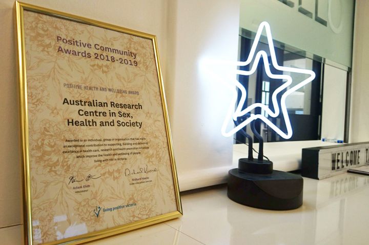 The award was accepted by Dr Jen Power and Jen Johnson at the recent Positive Community Awards, on behalf of ARCSHS and the HIV Futures team, including ARCSHS Centre Director Professor Suzanne Fraser, and W3 lead researcher Associate Professor Graham Brown.