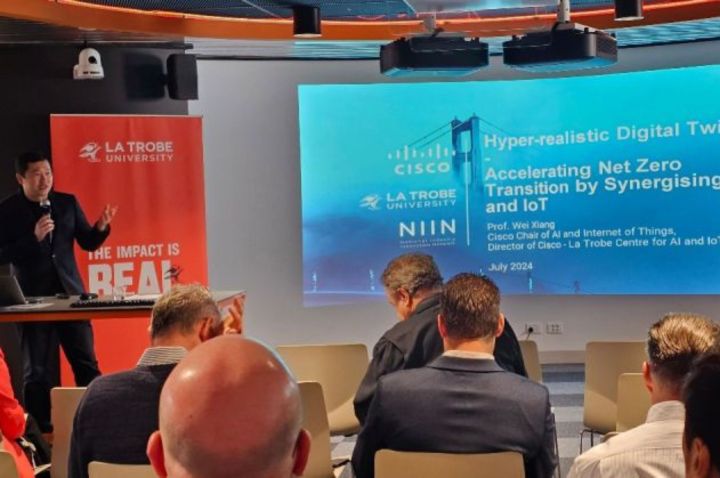 Professor Wei Xiang, Cisco Research Chair of AI and IoT at La Trobe University, introduced the concept of hyper-realistic digital twins. These digital replicas of physical assets can simulate various scenarios, providing invaluable insights into optimising energy consumption and accelerating the transition to net-zero emissions by synergising AI and IoT.