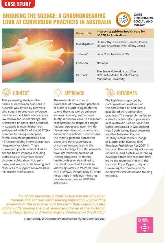 Dr Timothy Jones and team will investigate the scope and nature of LGBTQA+ conversion practices in Australia and develop resources to improve the mental health care of survivors and support enhanced safety in pastoral care with LGBTQA+ people. Read about the final community report here.